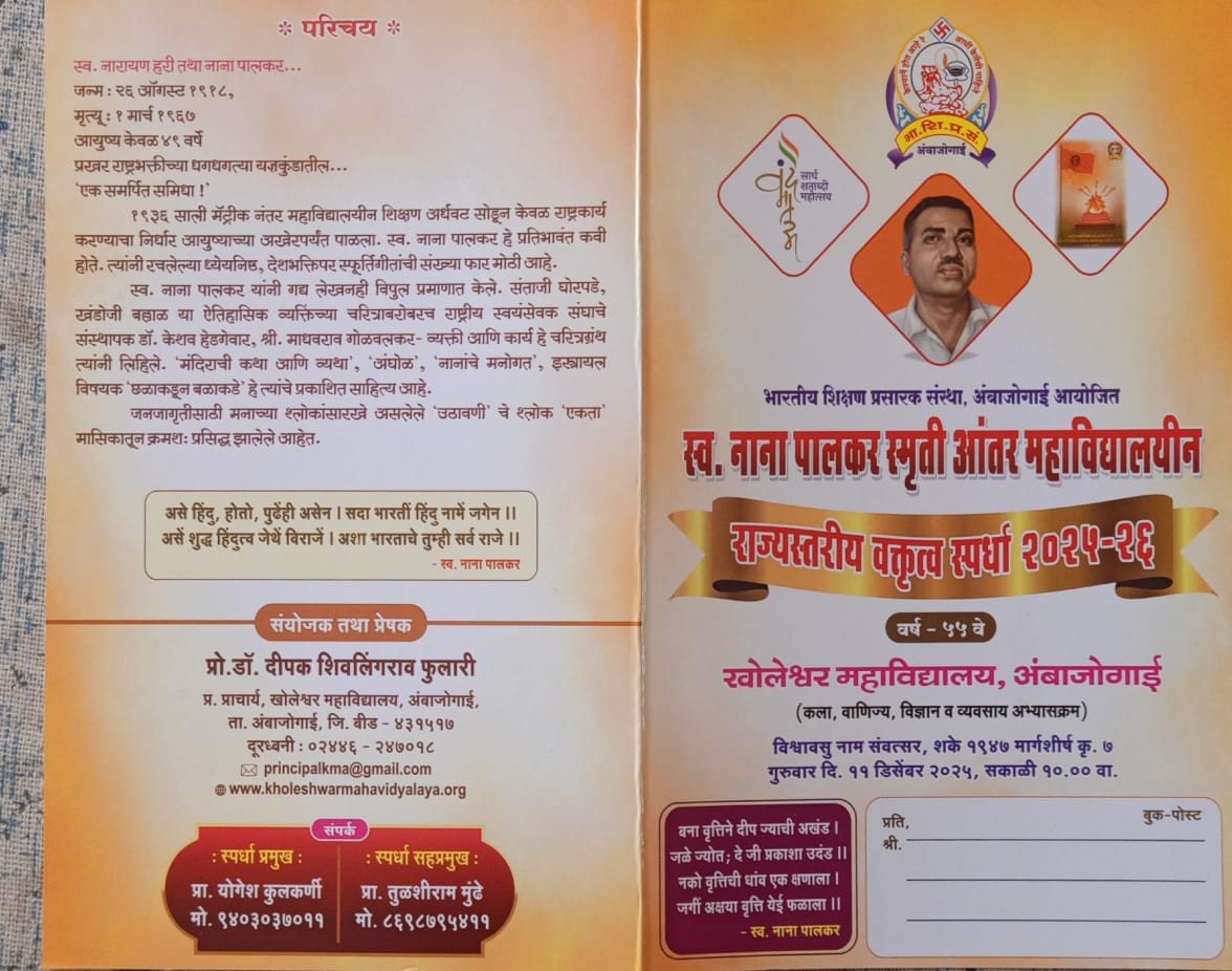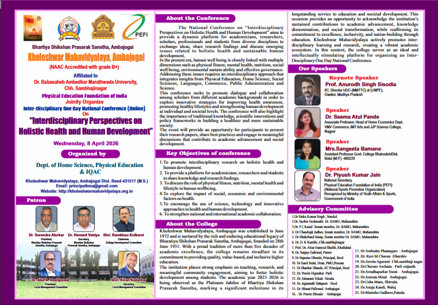 Kholeshwar Mahavidyalaya is run by Bhartiya Shikshan Prasarak Sanstha, Ambajogai. It is established on 28th June 1951.